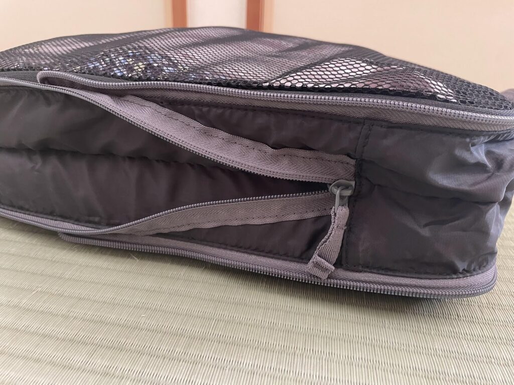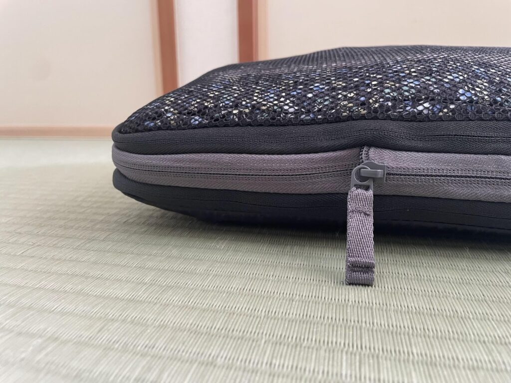 真ん中にあるファスナーを閉めると、圧縮されるという代物。