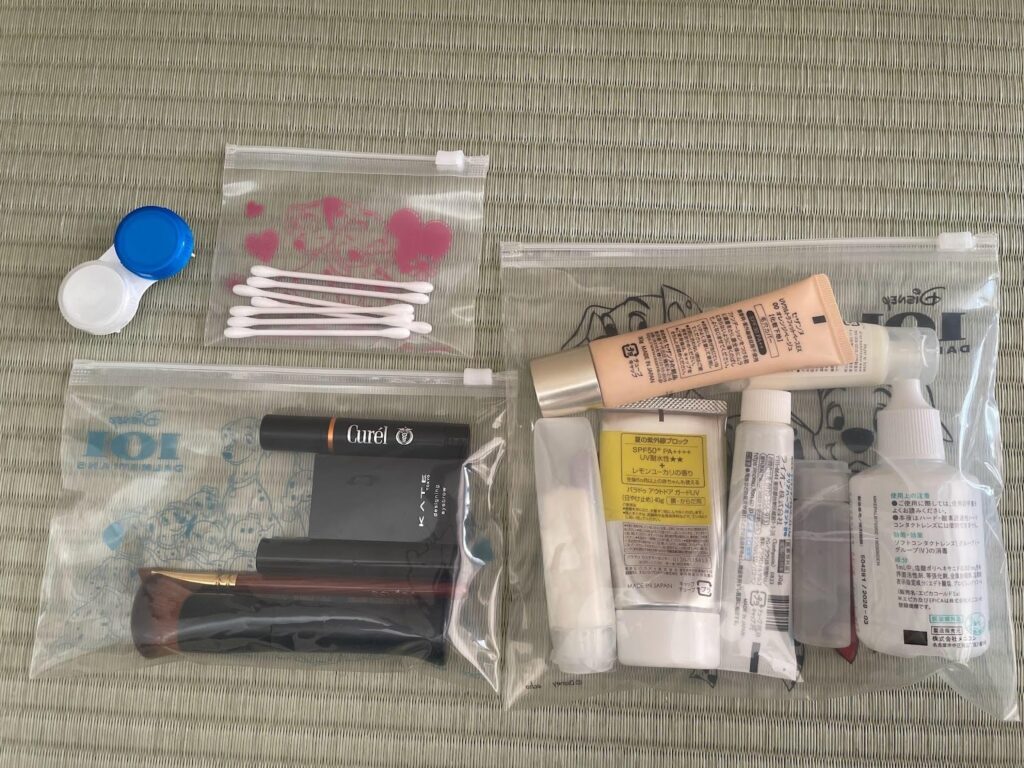 メイク道具はいつものものを、袋へ入れるだけ。簡単に準備を終えました。
