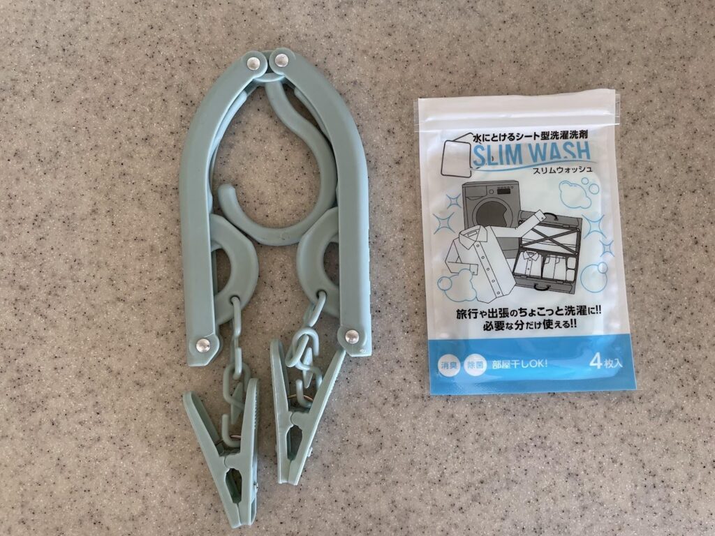 洗濯の準備も。このようなグッズは色々なタイプのものが売っています。私のはハンガー型。