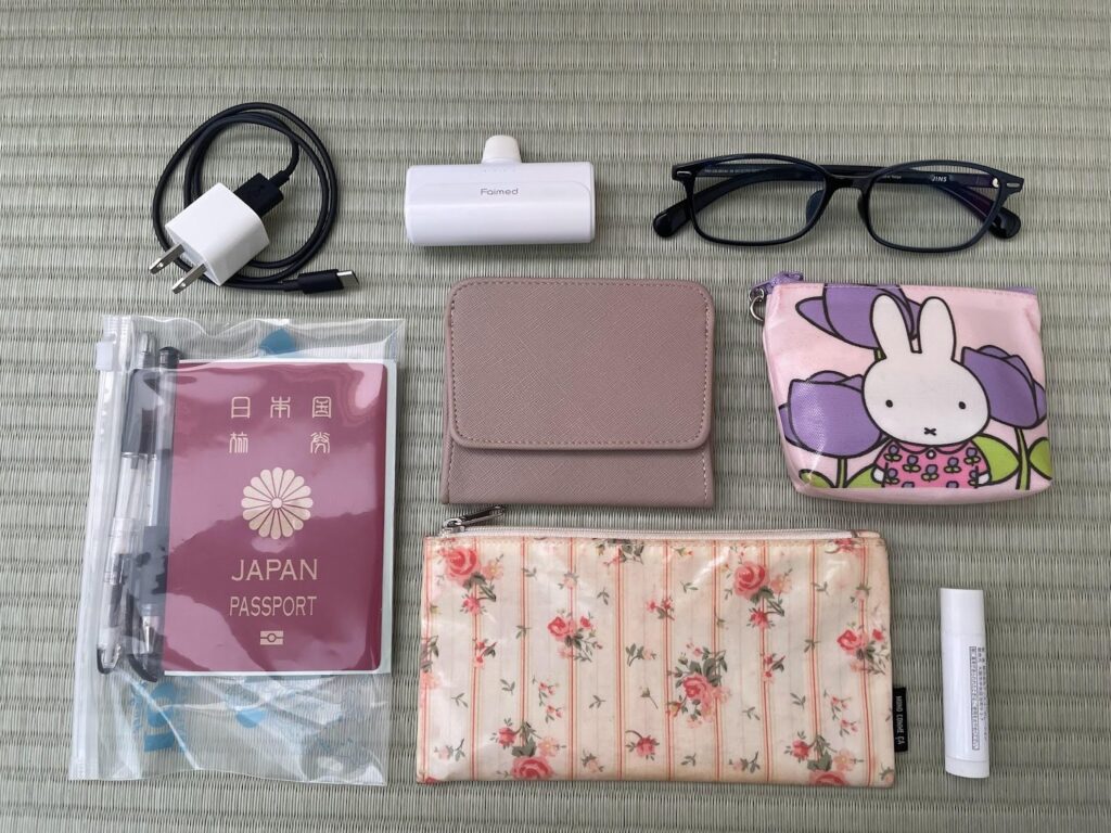 私が、機内で手元に置いていたものは以下のものたちです。
